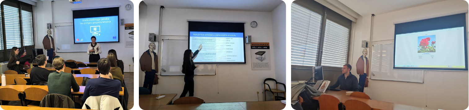 Predstavljanje projekta Mrežnik studentima polaznicima kolegija Uvod u leksikografiju, Filozofski fakultet Sveučilišta u Zagrebu, 10. studenoga 2025. (Lana Hudeček, Maja Matijević i Josip Mihaljević)