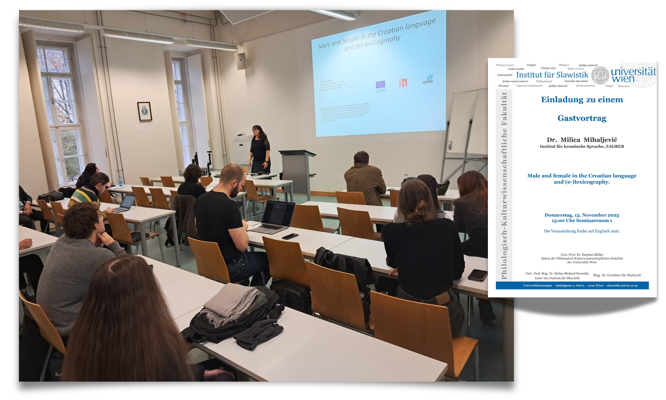 Na Institutu za slavistiku bečkoga sveučilišta Milica Mihaljević održala je izlaganje Male and female in the Croatian language and (e-)lexicography. U sklopu predavanja predstavila je rad na Hrvatskome mrežnome rječniku – Mrežniku. Posebnu je pozornost posvetila obradi mocijskih parnjaka u Mrežniku. Također je predstavila Rječnik za nasljedne i neizvorne govornike te primjerak rječnika poklonila slavističkoj knjižnici. Nakon predavanja odgovarala je na brojna pitanja slušatelja.