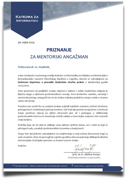 Priznanje za mentorski angažman u mentoriranju studenata s Odsjeka za informacijske i komunikacijske znanosti Filozofskoga fakulteta Sveučilišta u Zagrebu (Lana Hudeček)