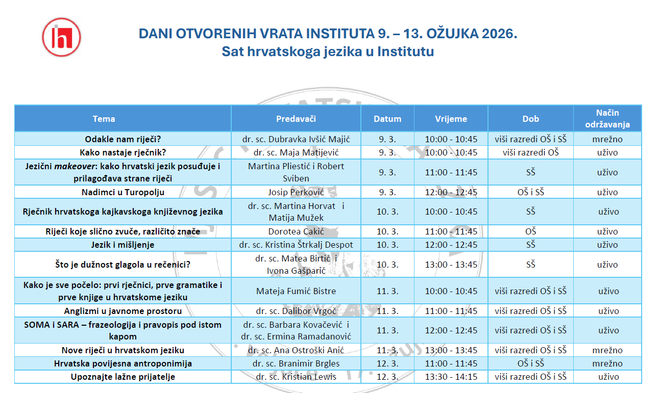Institut za hrvatski jezik u povodu završetka Mjeseca hrvatskoga jezika organizira Dane otvorenih vrata u sklopu kojih će znanstvenici Instituta održati predavanja uživo i putem interneta za osnovne i srednje škole u Republici Hrvatskoj i inozemstvu te za sve zainteresirane pod nazivom Sat hrvatskoga jezika u Institutu.