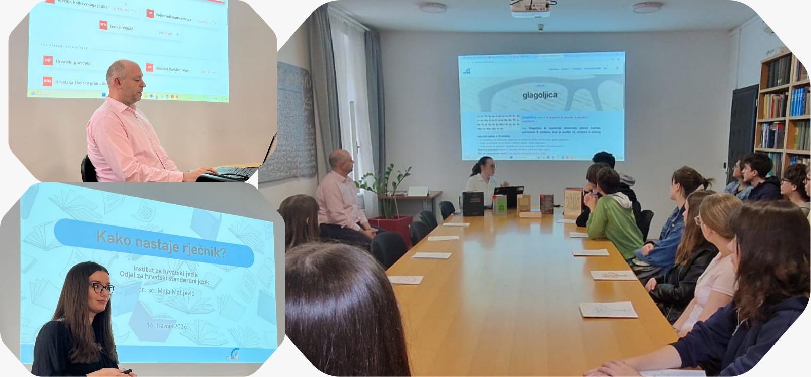 Učenici zagrebačke IV. gimnazije predvođeni profesorom Boškom Gojevićem posjetili su 16. travnja 2026. Institut za hrvatski jezik u sklopu izvanučioničke nastave. U Institutu su ih dočekali i pozdravili ravnatelj dr. sc. Željko Jozić, voditelj Odjela za hrvatski standardni jezik dr. sc. Kristian Lewis, znanstvena savjetnica u Odjelu za povijest hrvatskoga jezika dr. sc. Sanja Perić Gavrančić i suradnice Odjela za hrvatski standardni jezik dr. sc. Maja Matijević i Dorotea Cakić. Tijekom posjeta učenici su se pobliže upoznali s leksikografskim radom na Odjelu za hrvatski standardni jezik na primjeru Hrvatskoga mrežnog rječnika – Mrežnika, o kojemu je predavanje održala Maja Matijević, a igrifikaciju mrežnoga rječnika predstavila je Dorotea Cakić.